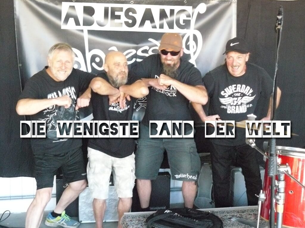 Gegründet 1978 als Schülerband in Genthin, einer von Kultur „sprudelnden“ Kleinstadt im Osten Sachsen Anhalts. Nach ständig wechselnden Besetzungen als Coverband, beschlossen wir Anfang 2023 mit der Boygroup „Abjesang“ einen Versuch mit eigener Musik zu starten. Die Musik hat uns alle auf unterschiedliche Art durchs Leben begleitet und immer begeistert. Nach dem Motto „Alter schützt vor Blödsinn nicht“ , hoffen wir, dass uns die Grütze im Kopp noch lange erhalten bleibt. Liebeslieder sind genug geschrieben, die Welt ist voll von Themen. Wir bedanken uns bei vielen Bands, die so wie wir im Netz rumdümpeln, oder es auch geschafft haben, für die Inspiration. Natürlich auch bei unsern Müttern, dass sie uns in diese Welt ließen. Man kann uns bei Interesse buchen für kleine Festivals oder Privat. Der Spaß steht im Vordergrund.
